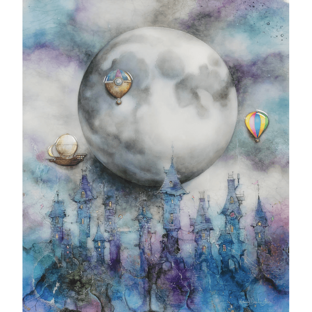 In So Long, Omaha, Kerry Darlington captures the pivotal moment where imagination transforms into destiny. Under a sweeping, moonlit sky, Oscar’s balloon drifts beyond gothic rooftops reminiscent of her Godric’s Hollow series — a quiet farewell to the familiar world and a gentle foreshadowing of the magic that awaits. It’s a scene where the ordinary brushes against the extraordinary, and belief quite literally takes flight.