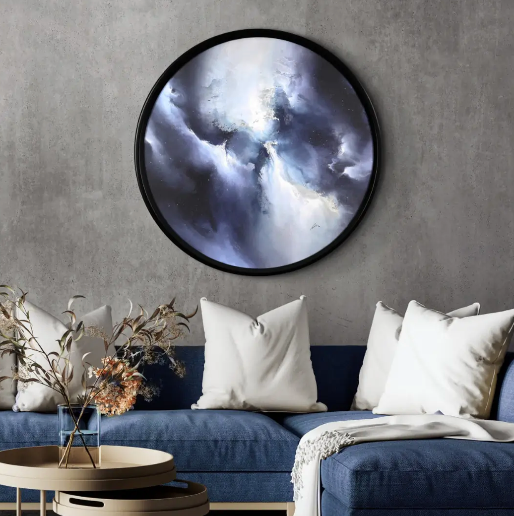 Circular in form, Where Light Begins is a striking departure within Simon Kenny’s portfolio, capturing the eternal interplay of darkness and illumination. Swirling tones of pearl white, charcoal, and gold radiate from the centre, evoking the birth of stars or the quiet power of an eclipse. At once cosmic and deeply meditative, this work reflects Kenny’s ability to conjure vast universes of emotion and atmosphere within abstract form, and the hand finishing with diamond dust gives it the subtle glitter of starlight. Where Light Begins is a canvas on board limited edition of 95; the image size is 32” in diameter.