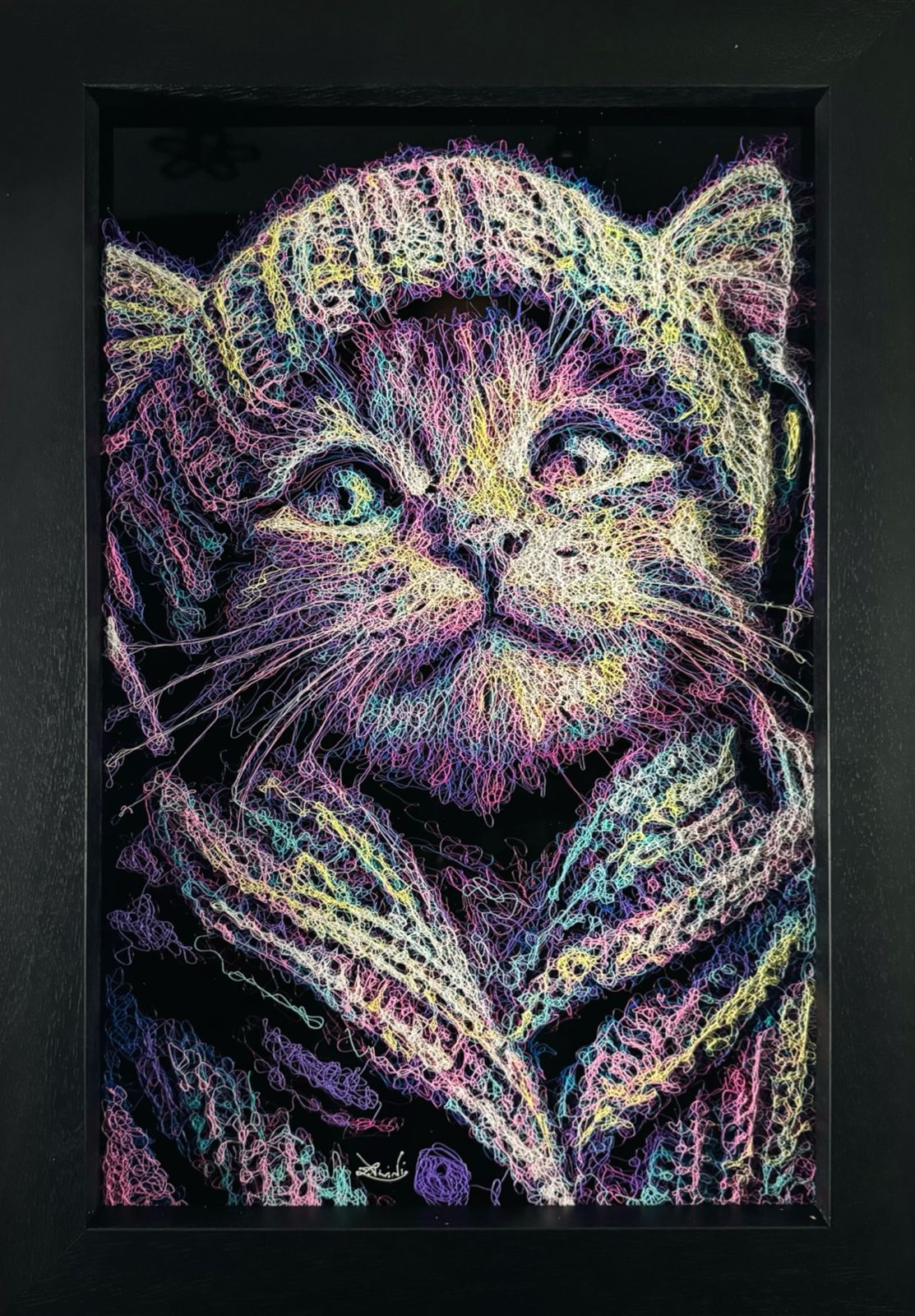 Add a cozy and whimsical touch to your decor with "Bobbin," a playful syringe art piece featuring a charming tabby cat wearing a woolly hat. This delightful design brings warmth and personality to any space, perfect for cat lovers who appreciate a bit of fun and creativity in their art collection.
