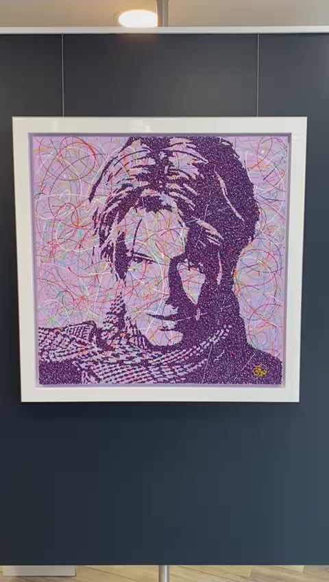 The iconic monochrome faces created by Jim Dowie emerge from the canvas through an abstract world of colourful intersecting lines. Each feature is beautifully described, yet close examination reveals that the immaculate detail is the result of a seemingly haphazard linear journey through a wide spectrum of light and energy